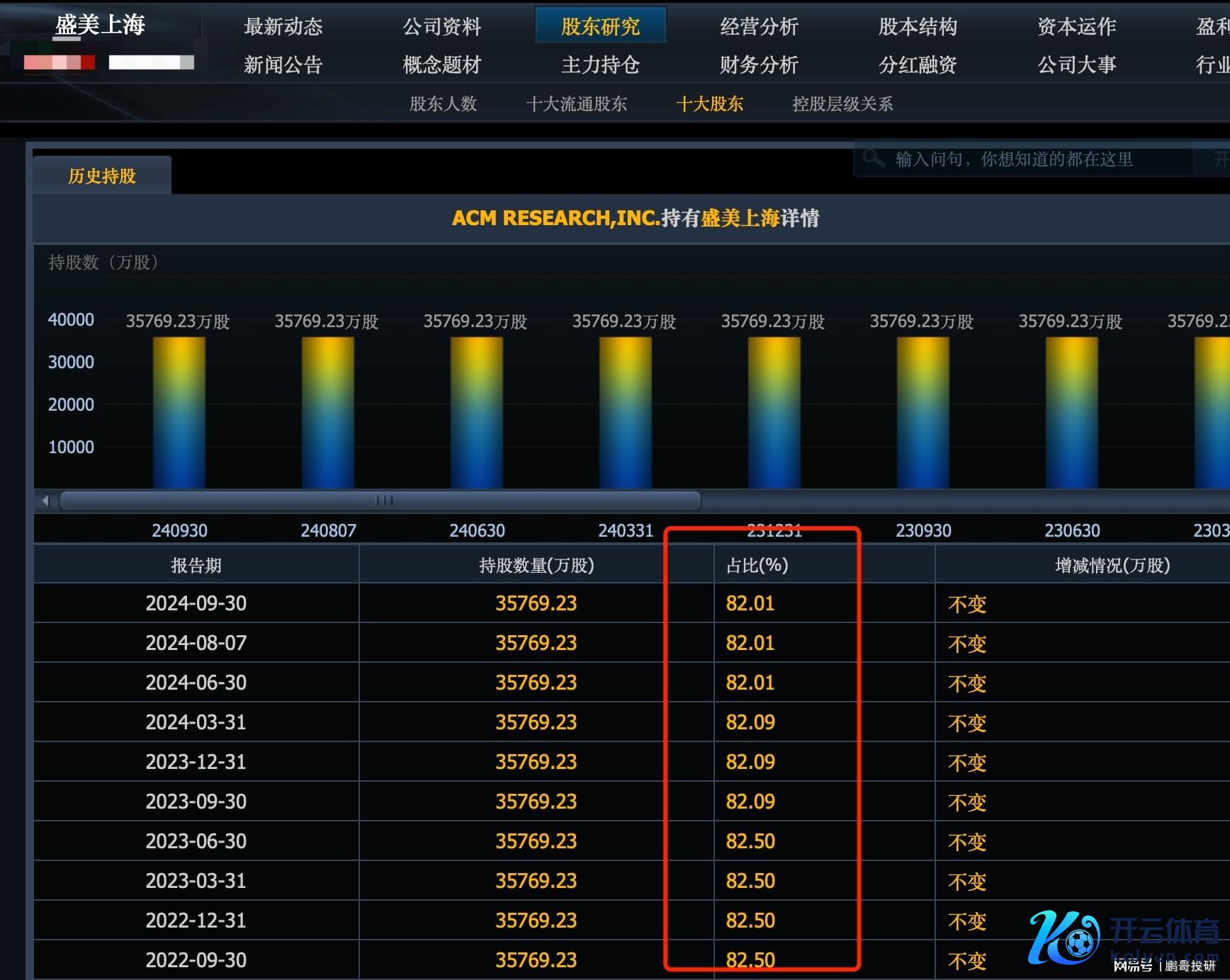 在以上这16个公司中,只好一个半导体股,那即是盛好意思上海,这个公司的的第一大推动是:ACM RESEARCH,INC,这个公司握有盛好意思上海3.58亿股,握股比例也极度高,高达总股本的82.01%,查证历史数据,这个推动从未减握过。