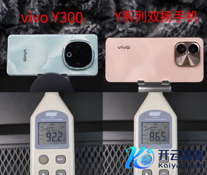 让vivo Y300和另外一款vivo Y系列双扬手机一样以最大音量播放《最炫民族风》,然后使用专科分贝仪测试,不错发现,vivo Y300的最高声压级达到了92.2dB ,远高于另外一款vivo Y系列双扬手机的86.5dB。