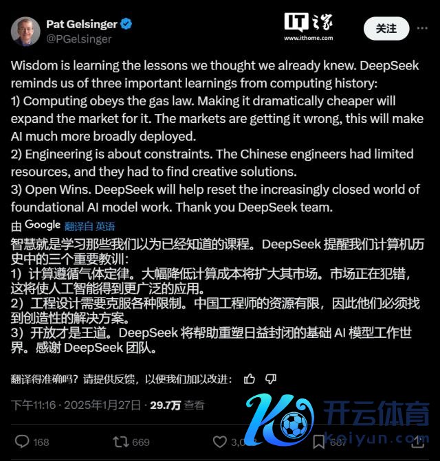 DeepSeek 推出的这一高性能、低资本的模子在科技行业激励了热烈的反响。英特尔前 CEO、硬件工程师、现在担任行将上市的初创公司 Gloo(一家面向教堂的通信和互动平台)董事长的帕特・基辛格(Pat Gelsinger)在 X 上兴盛地默示:"感谢 DeepSeek 团队。"他在英特尔任员工夫,曾试图通过推出英特尔的替代 AI GPU —— Gaudi 3 AI 来追逐英伟达,但未能见效。客岁 12 月,基辛格离开了英特尔。